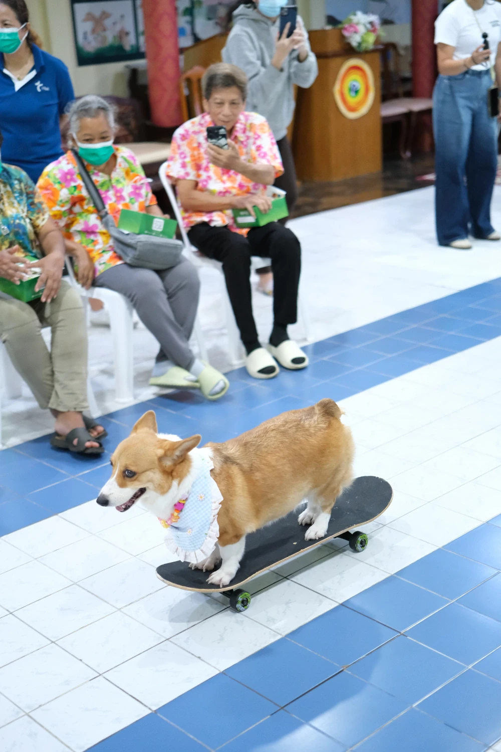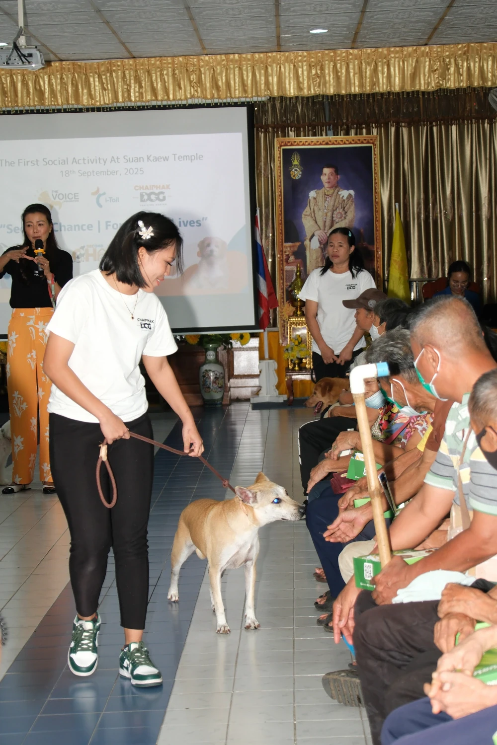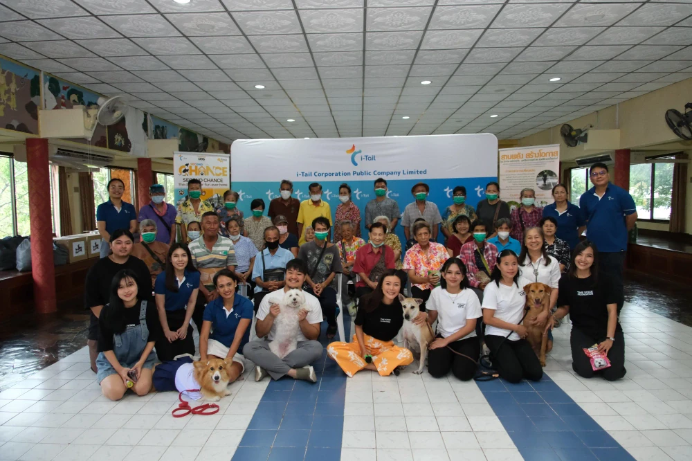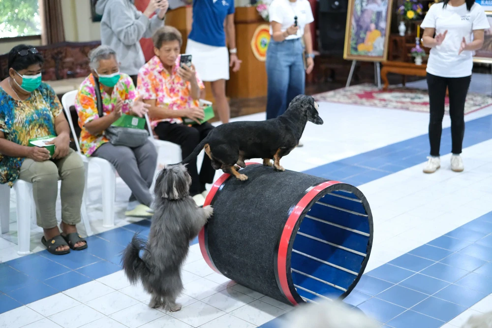 As part of the event, i-Tail introduced dogs from the “Second Chance” project — including Nong Kai Tom and Nong Pak Kard — along with dogs from The Voice Foundation and Chaiphak Dog Training Center, to interact with elderly residents of the Suan Kaew community.
